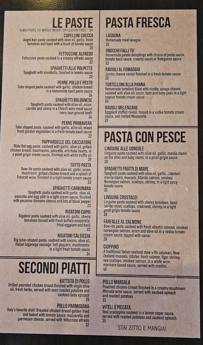 Big tube pasta, sautéed with onion, olive oil, italian Luganega sausage, bell peppers And mushrooms, in a light fresh tomato sauce.