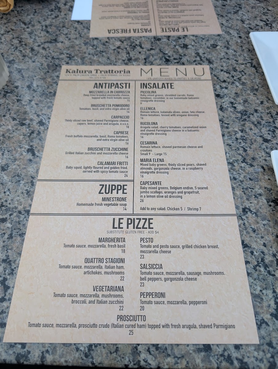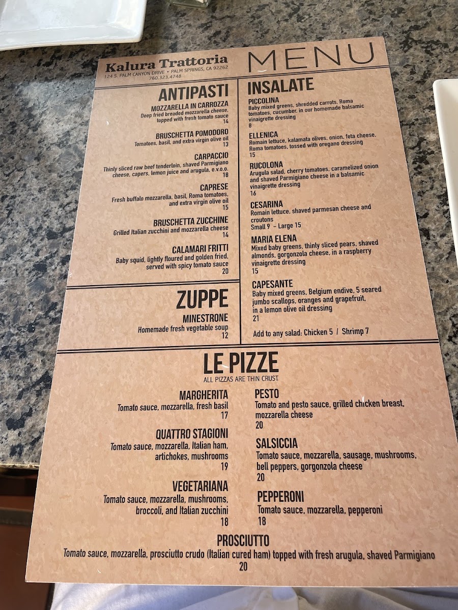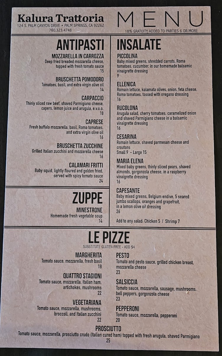 Welcome to Kalura Trattoria, where we invite you to savor the true essence of Italian cuisine! Our menu is a delightful tapestry of traditional dishes meticulously crafted to tantalize your taste buds. From our creamy Spaghetti Carbonara to the zesty Prosciutto Pizza, each dish tells a story of rich flavors and culinary passion. Don't miss our homemade Tiramisu, the perfect sweet ending to your meal, or sip on a refreshing Negroni as you indulge in our vibrant offerings like the Pizza Vegetariana and Chicken Parmesan with Spaghetti. Located at 124 S Palm Canyon Dr, Palm Springs, CA, we promise an unforgettable dining experience that will have you coming back for more. Join us and let your palate explore the best of what Kalura Trattoria has to offer!