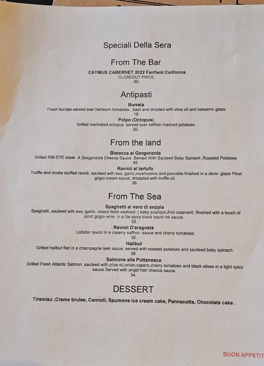 A traditional Italian stew, with calamari, NewZeland muscles, lobster, fresh salmon, tiger shrimp, sea scallops, smoked salmon, in a white wine marinara base sauce served with crostini bread.