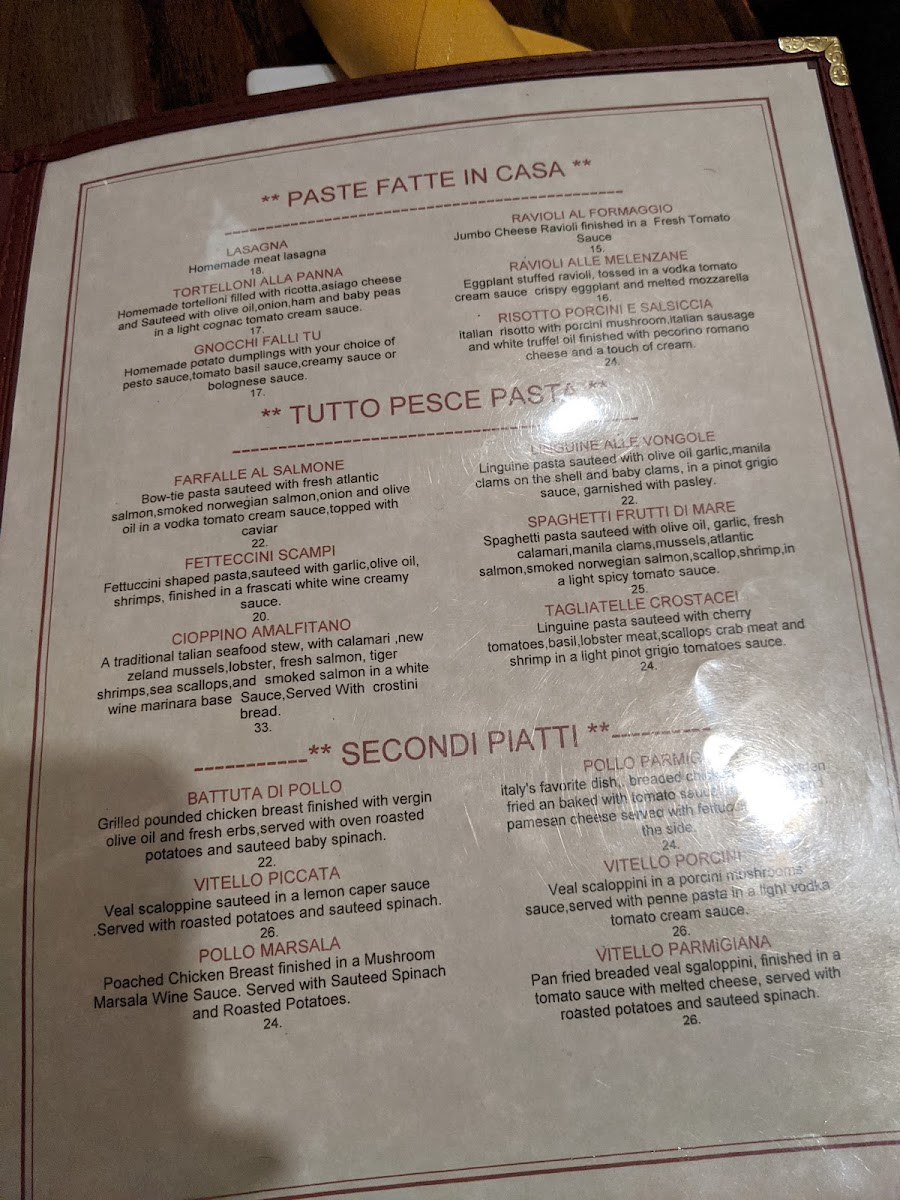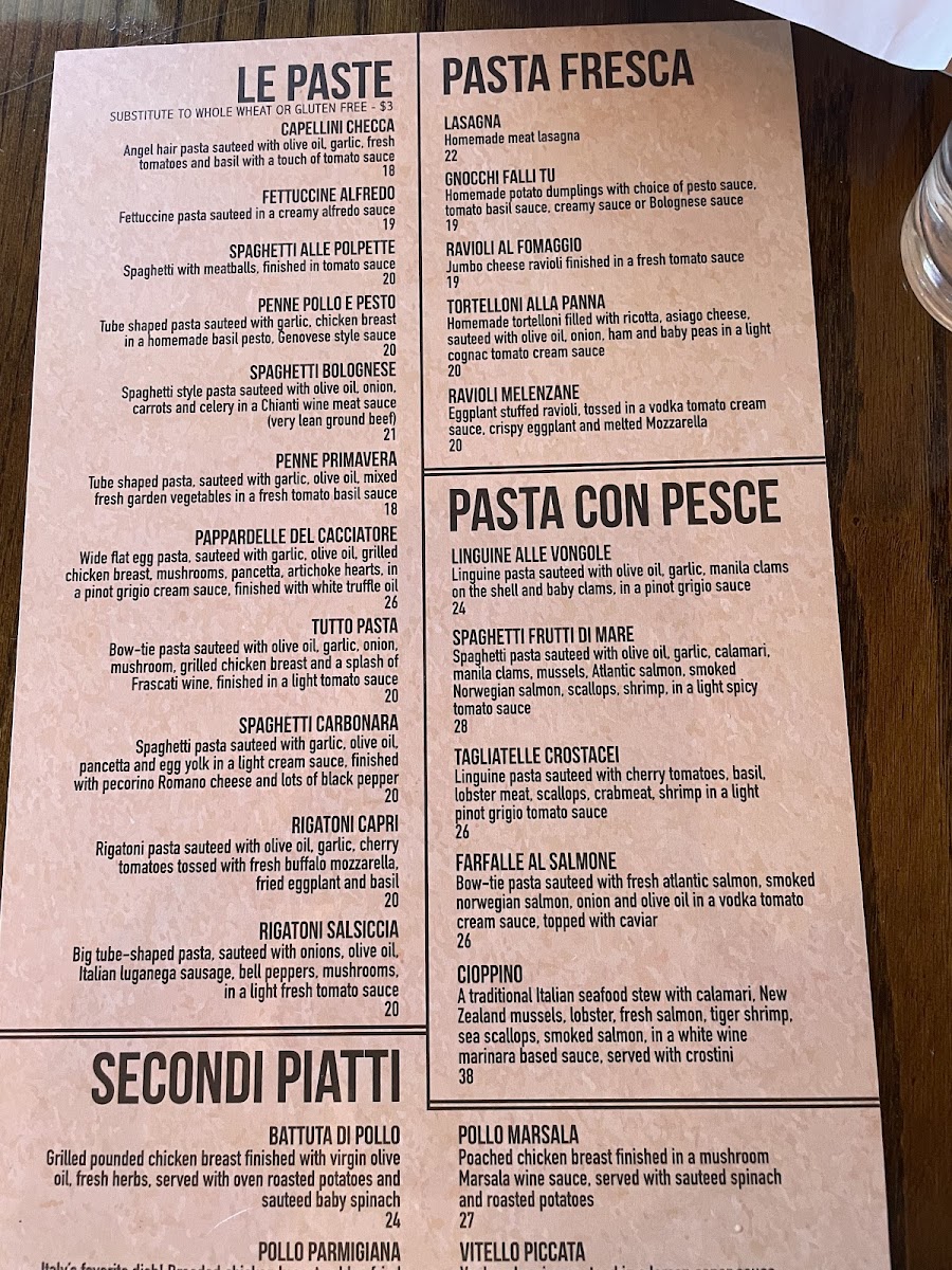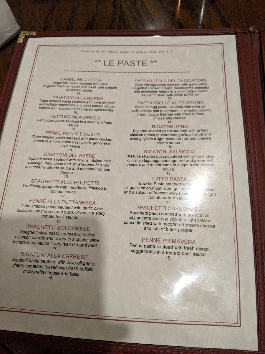 Wide flat egg pasta, sautéed with garlic, olive oil, grilled chicken breast, mushrooms, pancetta and artichokes hearts in a pinot grigio cream sauce Finished with white truffle oil.
